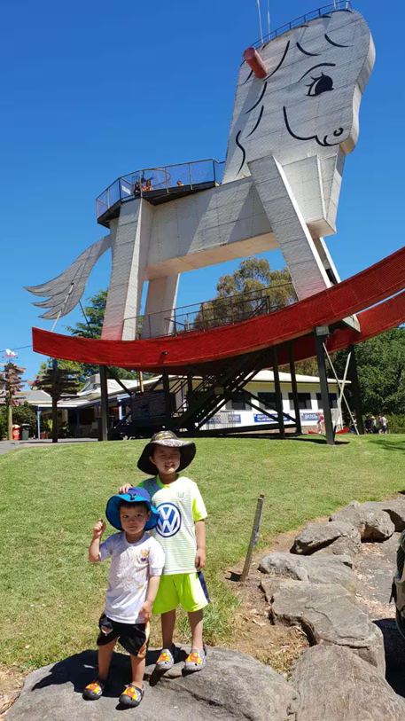 Hai em bé rạng rỡ trước Big Rocking Horse - điểm đến thân thiện cho gia đình ở Gumeracha. Credit: Hong Huynh