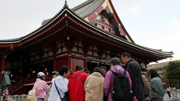 Khách du lịch Trung Quốc tụ tập gần Chùa Sensoji, một điểm tham quan nổi tiếng ở quận Asakusa, Tokyo vào ngày 18/11. Một số công ty lữ hành lớn của Trung Quốc đã ngừng bán các tour du lịch Nhật Bản do quan hệ giữa hai quốc gia trở nên xấu đi. © Reuters