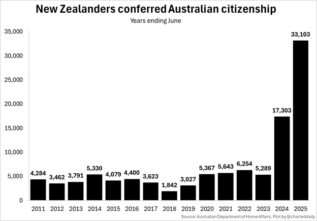 Gợi ý cái gọi là "Hiệu ứng Albo", một đợt gia tăng đáng kể về số lượng người Tân Tây Lan có được quốc tịch Úc.