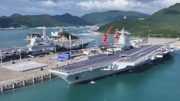 Tàu Phúc Kiến, tàu sân bay đầu tiên của Trung Quốc được trang bị máy phóng điện từ (bên phải), đang đậu tại một cảng hải quân ở thành phố Tam Á, tỉnh Hải Nam, miền nam Trung Quốc, vào ngày 05/11. Tàu chiến này dự kiến sẽ được triển khai trong trường hợp khẩn cấp ở Đài Loan. © Tân Hoa Xã/AP