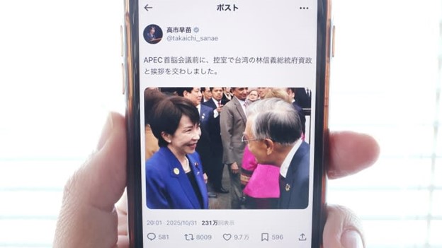 Thủ tướng Nhật Bản Sanae Takaichi chào Lâm Tín Nghĩa, cố vấn cấp cao của Tổng thống Đài Loan và chủ tịch của Taiwania Capital Management, trước thềm hội nghị thượng đỉnh APEC tại Gyeongju, Hàn Quốc, vào ngày 31/10. Dòng tweet của bà về cuộc gặp gỡ này đã gây ra một làn sóng phản đối ngoại giao. (Trích từ bài đăng trên X của Sanae Takaichi)