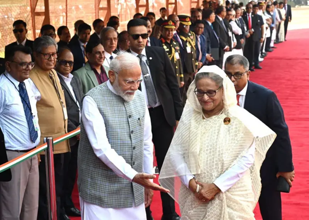 Thủ tướng Ấn Độ Narendra Modi đón tiếp bà Sheikh Hasina, khi đó là thủ tướng Bangladesh, tại Dinh Tổng thống Rashtrapati Bhawan vào ngày 22/6/2024 tại New Delhi, Ấn Độ