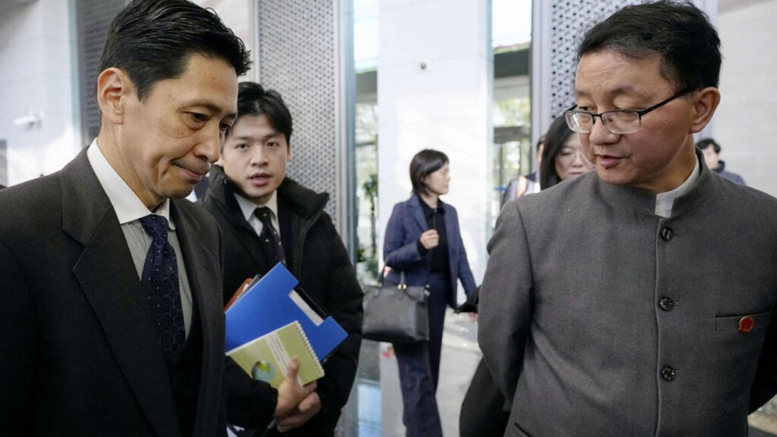 Masaaki Kanai (bên trái), vụ trưởng vụ châu Á và châu Đại Dương, bộ Ngoại Giao Nhật Bản, trò chuyện với Liu Jinsong, vụ trưởng vụ châu Á, bộ Ngoại Giao Trung Quốc, trước cuộc họp tại Bắc Kinh, Trung Quốc, ngày 18 tháng 11 năm 2025. via REUTERS - KYODO
