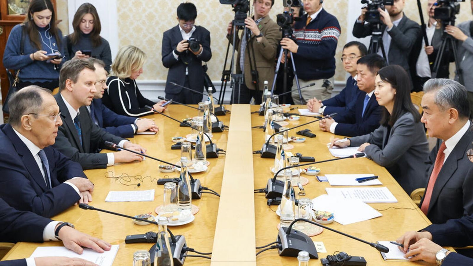 Ngoại trưởng Nga Sergei Lavrov (T) hội đàm với đồng nhiệm Trung Quốc Vương Nghị tại Matxcơva, Nga, ngày 02/12/2025. AP