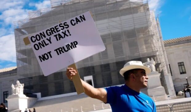 Một người biểu tình cầm tấm biển có dòng chữ "Quốc hội chỉ có thể đánh thuế! Không phải Trump" bên ngoài Tòa án Tối cao Hoa Kỳ tại Washington vào ngày 5 tháng 11. Ảnh: Andrew Harnik/Getty Images