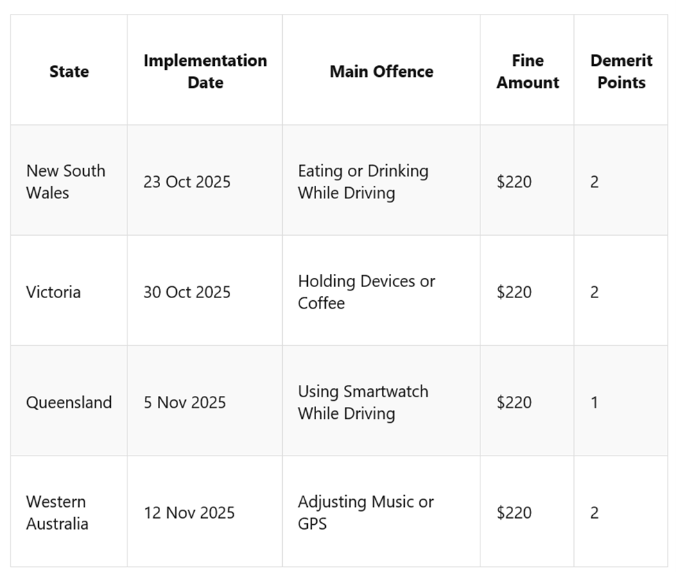 Mỗi tiểu bang ở Úc sẽ áp dụng quy định khác nhau. Tại New South Wales, luật sẽ có hiệu lực ngay lập tức vào ngày 23 tháng Mười năm 2025. Tiểu bang Victoria sẽ áp dụng các quy định tương tự một tuần sau đó, tập trung trước tiên vào các thành phố lớn như Melbourne và Geelong. Queensland và Tây Úc dự kiến sẽ điều chỉnh hệ thống của họ vào đầu tháng Mười một. Người lái xe được khuyến khích xem trang mạng (website) chính thức của cơ quan quản lý đường bộ tại tiểu bang của họ để biết danh sách các mức phạt cụ thể. Nhìn chung, mức phạt 220 đô-la nhằm mục đích bảo đảm tính nhất quán trong việc thực thi luật giao thông trên toàn quốc, nhưng mọi người cho rằng thời điểm áp dụng - ngay trước kỳ nghỉ lễ - khiến tiến trình chuyển đổi trở nên căng thẳng hơn.
