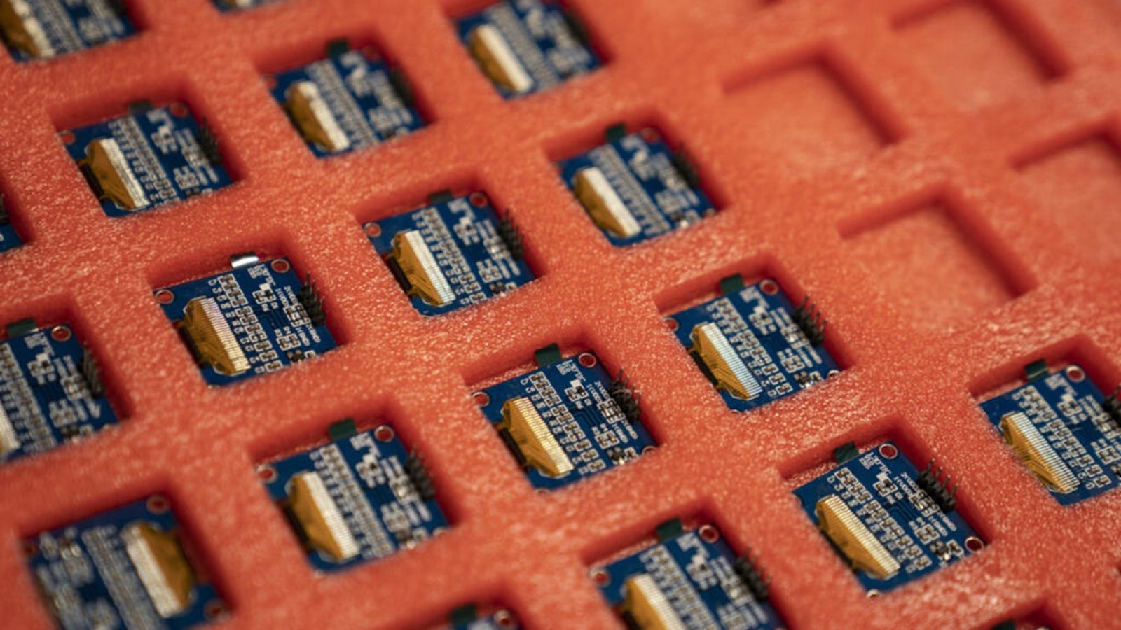 Ảnh minh diễn : Chip bán dẫn được lắp ráp và sắp xếp trên bàn làm việc trước lễ cắt băng khánh thành trung tâm sản xuất Nanotronics tại Xưởng Hải quân Brooklyn, New York, Mỹ, ngày 28/04/2021. AP - John Minchillo