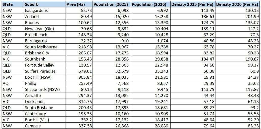 Phần lớn các vùng ngoại ô được dành riêng cho việc tăng mật độ dân số đang chứng kiến sự gia tăng nhanh chóng của các dự án nhà ở mật độ cao, chẳng hạn như dự án cao ốc chúng cư Chevron One trên Chevron Island, vùng ngoại ô Broadbeach, tiểu bang Queensland, là một khu vực hiện đang đón nhận những tòa cao ốc đầu tiên sau khi quy hoạch lại.