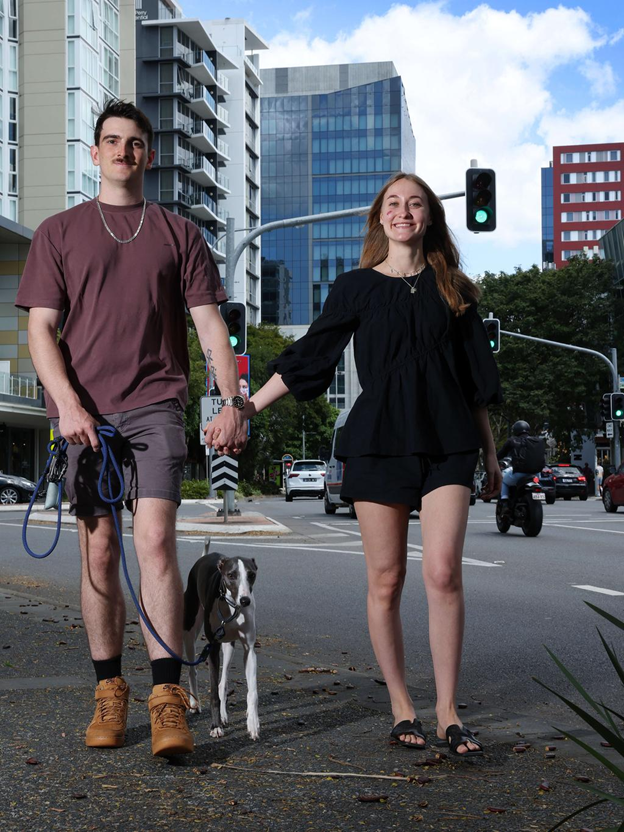 Zac Nicholas và Sam Watts cùng chú chó Walter của họ sống ở vùng ngoại ô nhà cừa mật độ cao Newstead. Ảnh: Liam Kidston