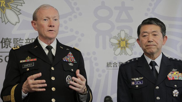 Ảnh tư liệu : Tham mưu trưởng Liên quân Lực lượng Phòng vệ Nhật Bản Shigeru Iwasaki (bên phải) tại bộ Quốc Phòng ở Tokyo, Nhật Bản, ngày 26/04/2013. AP - Itsuo Inouye