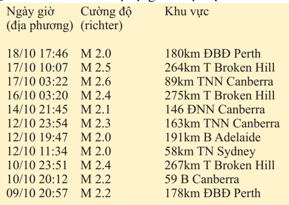 Ông Pascale lưu ý công chúng “Chúng tôi đã phát hiện một trận động đất mỗi tuần ở Đông Nam Úc và thường có khoảng 30 hoặc 40 trận động đất ở đó... luôn có những trận động đất xảy ra mà mọi người không nhận ra, và thường thì cứ khoảng một tháng lại có một trận động đất được cảm nhận.” Văn Phòng Khoa học Địa chất Úc (GA) luôn cập nhật thông tin về động đất tại Úc từng giây từng phút trên trang mạng của mình https://earthquakelist.org/australia (The complete Australia earthquake report - up-to-date 2025). Đơn cử 10 ngày về trước từ ngày hôm nay 19/10, các vụ động đất được liệt kê như sau: