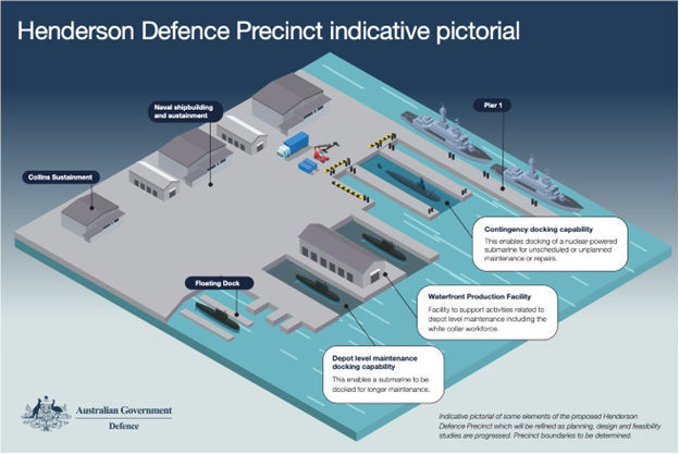 Xưởng đóng tàu Henderson Defense sẽ có các cơ sở vật chất để hỗ trợ việc duy trì các chiến hạm mặt nước của Úc, có chỗ neo đậu dự phòng cho hạm đội tiểm thủy đỉnh chạy bằng năng lượng nguyên tử, được trang bị võ khí thông thường trong tương lai của Úc từ đầu những năm 2030 và dịch vụ bảo trì chuyên sâu, và có cả các ụ khô (dry dock).