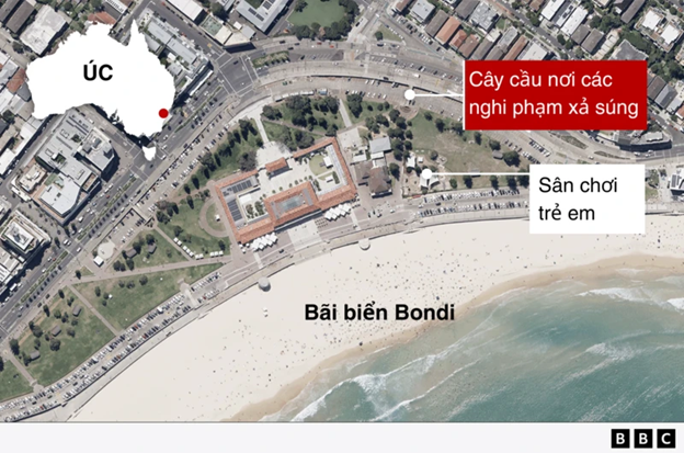 Những đoạn video được BBC xác minh dường như cho thấy hai tay súng bắn từ một cây cầu nhỏ tại bãi đậu xe trên đường Campbell Parade hướng về phía bãi biển Bondi.